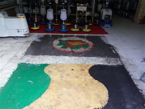 5.待4小时或一晚以上,采用美石地坪研磨机配合500#树脂研磨片打磨水磨石地面,打磨同时,采用吸尘机吸水机吸干地面的污水泥浆。研磨同时配以清水过净、吸水机吸净地面。