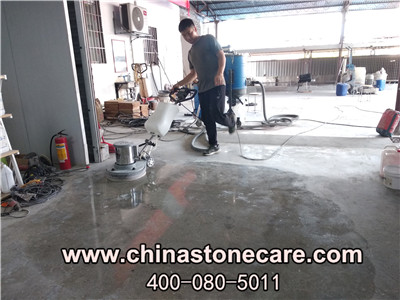 做固化抛光处理,固化抛光处理是一种硅酸盐的渗透、胶结原理。使混凝土地坪内部水泥、砂孔隙填充胶结更密实。从而强度增大。