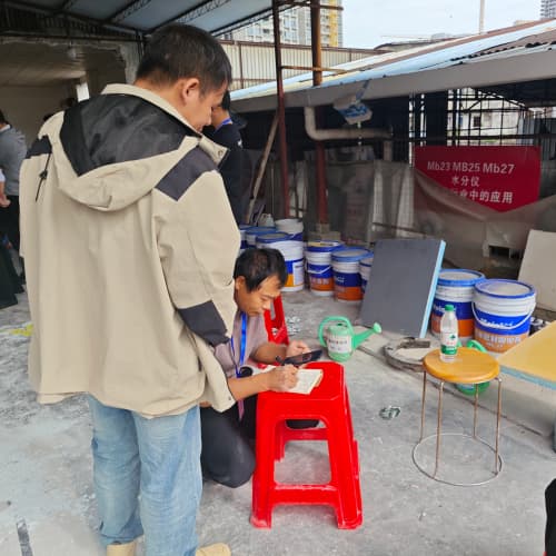 理论课上,广州澳恒杨总杨老师以无机磨石的基础概念与分类为切入点,循序渐进拆解施工前期摊铺工艺的核心知识体系。他明确无机磨石施工的三大核心板块 —— 基础抗裂层、无机磨石层、表面处理层,逐一深度解析技术要点。除核心施工工艺外,杨老师还分享客户需求挖掘技巧与商务谈判核心要点,指导学员结合客户预算、设计标准、使用场景及项目流程制定定制化解决方案,并通过实际案例拆解成本核算的全流程操作。 此外,杨老师还详细拆解了无机磨石在停车场场景下的应用,明确了对车道、车位、电梯入户口三大区域,应采用不同材料应对不同需求的适配逻辑。学员全程专注投入,课上课下围绕技术难点与实际应用跟杨老师互动。针对各类疑问,杨老师均给予细致耐心的解答,助力学员吃透核心知识点。